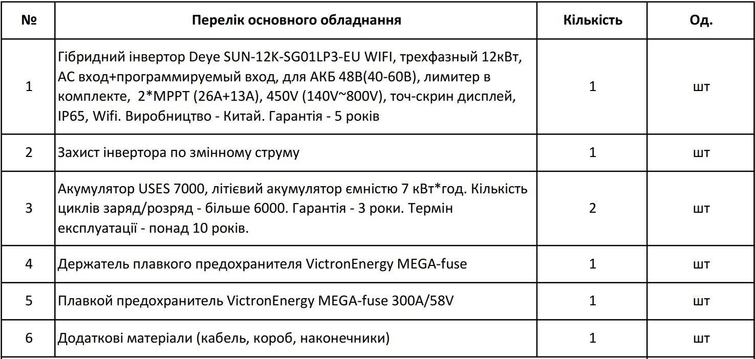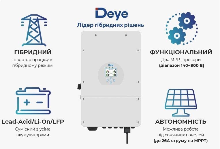 Источник бесперебойного питания – это гибридная солнечная электростанция без солнечных панелей, которые по желанию можно доставить в любой момент. Используется как резеврный источник электроэнергии, при отключении электроснабжения сети станция способна снабжать потребителя электроэнергией с помощью заряжаемых от сети аккумуляторных батарей. Гибридный инвертор Deye SUN-12K-SG03LP3-EU – это высококачественный продукт от ведущего китайского производителя оборудования для зеленой энергетики, считается одним из лучших инверторов гибридного типа на рынке. Работает в автономном (от аккумуляторов) и в сетевом режимах, что позволяет подключать вашу станцию к государственной программе "зеленый тариф", оснащенный функцией Wi-fi мониторинга, позволяющей следить за работой станции, кроме того, имеет вход для генератора, позволяющего зарядить аккумуляторы при длительном отсутствии сети.
