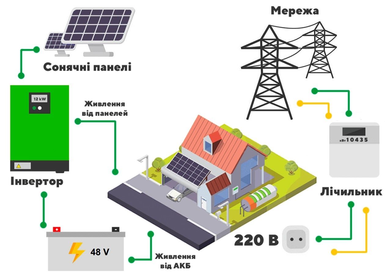 Гібридна сонячна електростанція використовується для зменшення власного споживання від мережі, а також для продажу надлишків згенерованої енергії за "зеленим" тарифом. Також, при відключенні електропостачання мережі, станція здатна забезпечувати споживача електроенергією за допомогою акумуляторних батарей, які заряджаються від надлишків виробленої сонячними панелями енергії. Основними складовими станції є фотоелектричні модулі, гібридний інверторт та акумуляторні батареї.