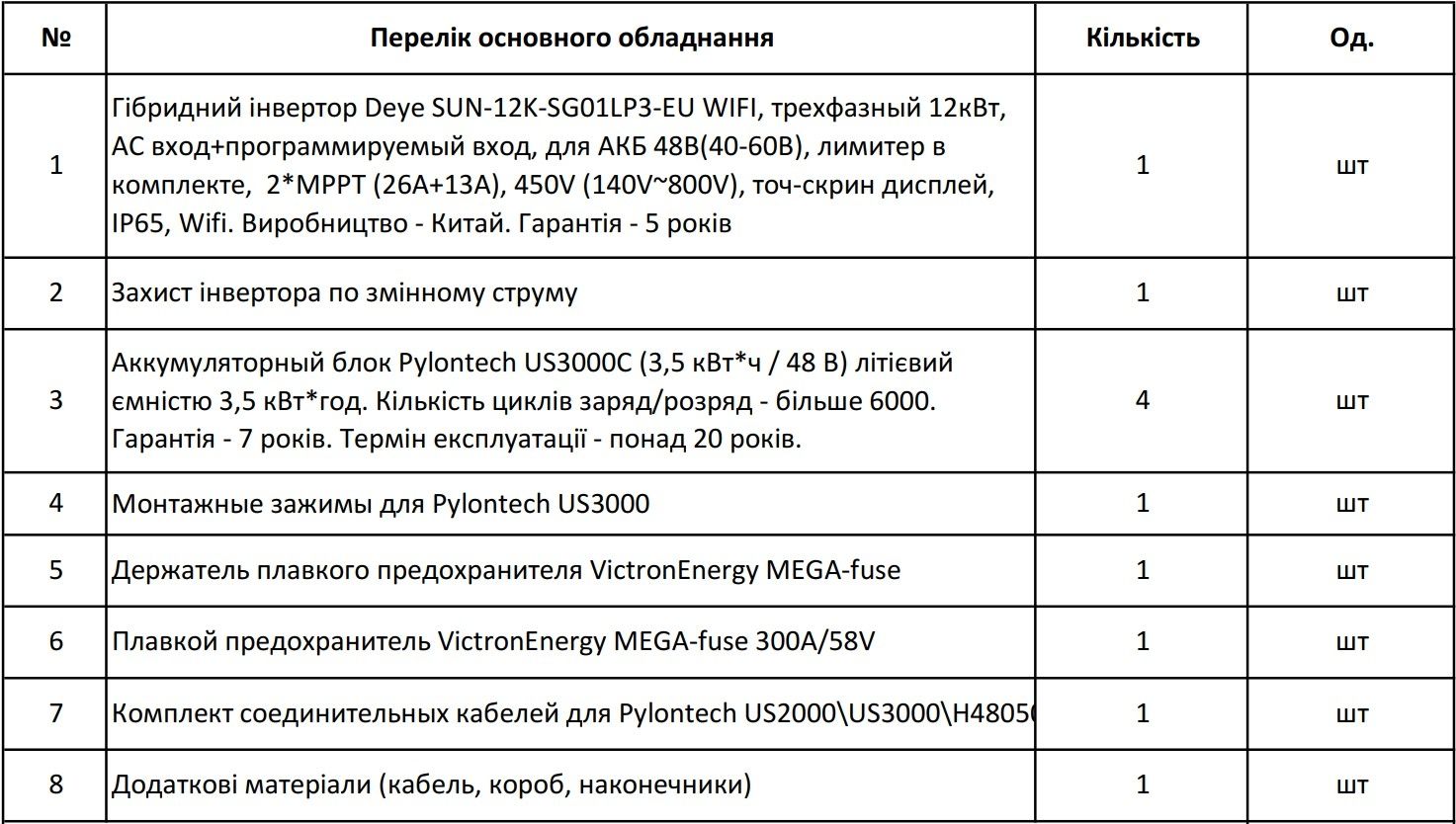 Джерело безперебійного живлення – це гібридна сонячна електростанція без сонячних панелей, які за бажання можна доставити у будь-який момент. Використовується як резеврне джерело електроенергії, при відключенні електропостачання мережі станція здатна забезпечувати споживача електроенергією за допомогою акумуляторних батарей, які заряджаються від мережі. Гібридний інвертор Deye SUN-6K-SG03LP1-EU – це високоякісний продукт від провідного китайського виробника обладнання для «зеленої» енергетики, вважається одним з кращих інверторів гібридного типу на ринку. Працює в автономному (від акумуляторів) та в мережевому режимах, що дозволяє підключати вашу станцію до державної програми "зелений тариф", оснащений функцією Wi-fi моніторингу, що дозволяє слідкувати за роботою станції, крім того, має вхід для генератора, що дозволить зарядити акумулятори при довгій відсутності мережі.