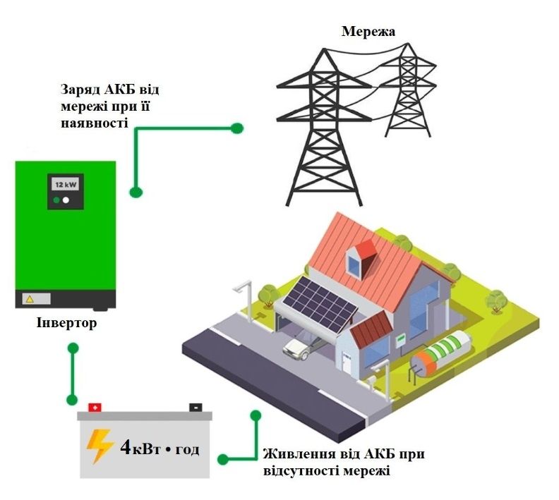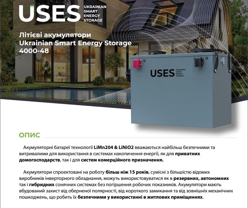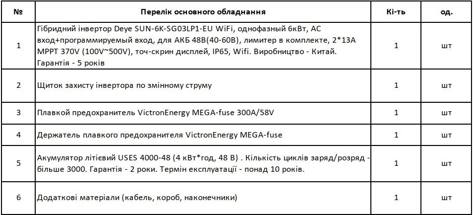 Джерело безперебійного живлення – це гібридна сонячна електростанція без сонячних панелей, які за бажання можна доставити у будь-який момент. Використовується як резеврне джерело електроенергії, при відключенні електропостачання мережі станція здатна забезпечувати споживача електроенергією за допомогою акумуляторних батарей, які заряджаються від мережі. Гібридний інвертор Deye SUN-6K-SG03LP1-EU – це високоякісний продукт від провідного китайського виробника обладнання для «зеленої» енергетики, вважається одним з кращих інверторів гібридного типу на ринку. Працює в автономному (від акумуляторів) та в мережевому режимах, що дозволяє підключати вашу станцію до державної програми "зелений тариф", оснащений функцією Wi-fi моніторингу, що дозволяє слідкувати за роботою станції, крім того, має вхід для генератора, що дозволить зарядити акумулятори при довгій відсутності мережі.